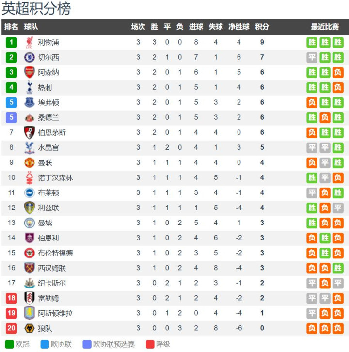 英超3轮战罢,利物浦成为本赛季唯一的豪取三连胜开局的球队,这意味着英超联赛全胜将军仅此利物浦一队了。切尔西2胜1平积7分排名第二,北伦敦双雄阿森纳、热刺、埃弗顿、升班马桑德兰、后防线五大主力卖了四人的伯恩茅斯都是2胜1负积6分排名第3-7名。
