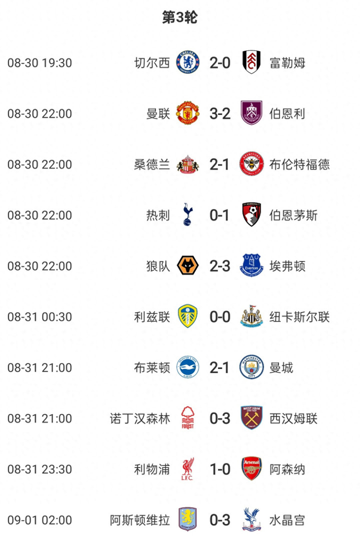 英超第3轮的比赛已经全部战罢,球队短暂停顿,开启9月份的国际比赛日。英超第3轮战况如下:切尔西2-0富勒姆、曼联3-2伯恩利、桑德兰2-1布伦特福德、热刺0-1伯恩茅斯、狼队2-3埃弗顿、利兹联0-0纽卡斯尔、布莱顿2-1曼城、诺丁汉森林0-3西汉姆联、利物浦1-0阿森纳、阿斯顿维拉0-3水晶宫。